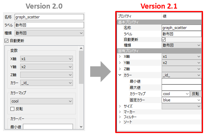 グラフの散布図において、X軸およびY軸の範囲をプロパティとして指定可能になりました。 また、グラフ画面において、座標軸範囲の「移動」や「拡大縮小」を行った場合も、同プロパティの値が自動的に同期されます。