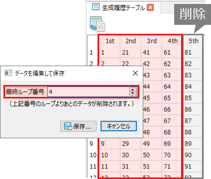 操作は、メニューから を選択し、 表示されたダイアログにて 最終ループ番号 を指定します。 (指定した番号の次の番号以降のループの各ケースが削除されます。)