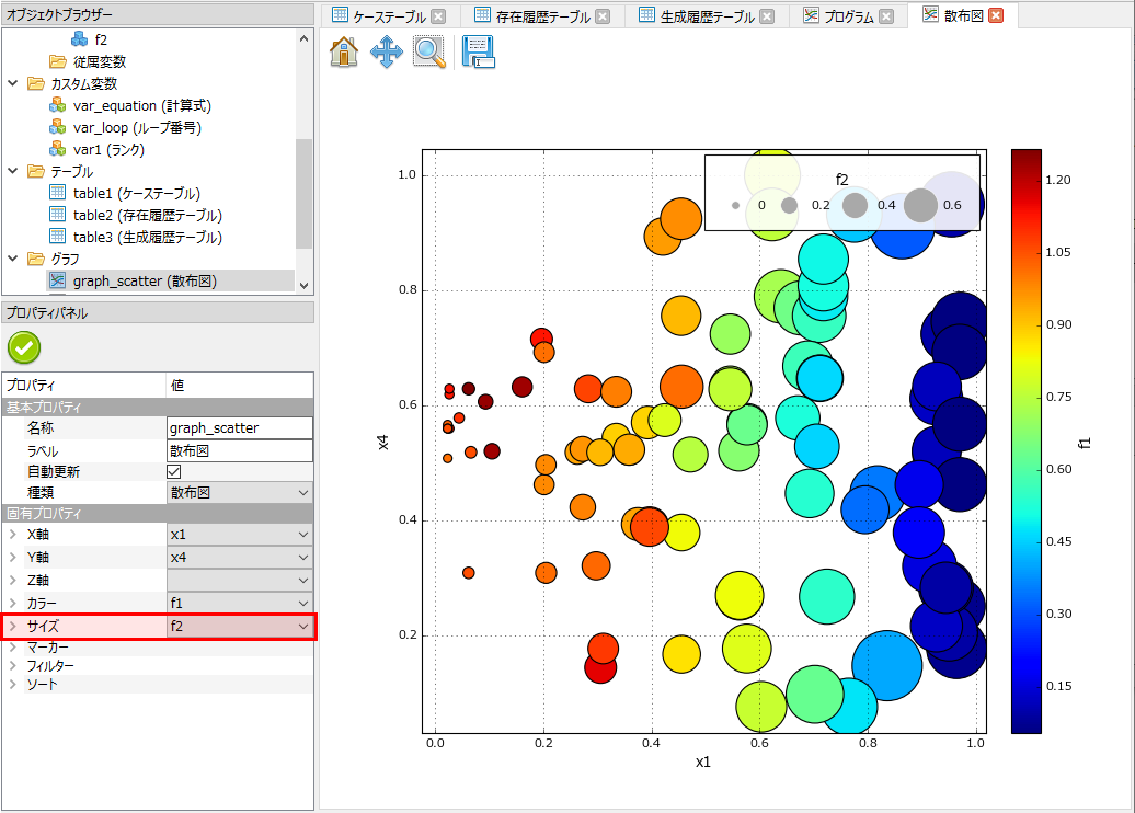 グラフの散布図および散布図行列において、サイズ(円の直径)に変数を指定可能になり、 いわゆるバブルチャートを作成できるようになりました。
