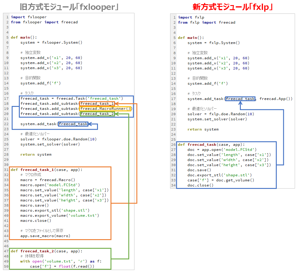 旧方式の「fxlooper」モジュールでは、「マクロ作成」「マクロ実行」「体積取得」の三つの処理を それぞれ関数等のサブタスクとして記述し、それらのサブタスクを合わせて一つのタスクとする必要がありました。